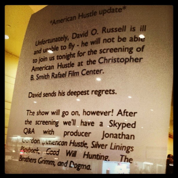 Along with Eszter, we arrived in a theater in Berkeley… Arrggghhhh… sooo disappointing. Was suppose to meet David O. Russell for a screening of “American Hustle” (and l wish him luck on winning Best Pic at the Oscars) only to be greeted by this.