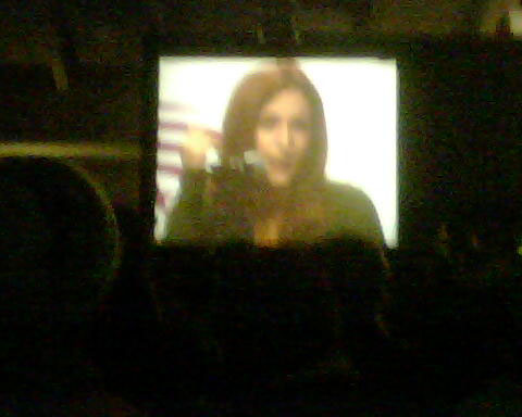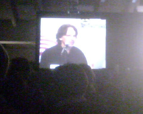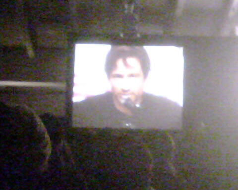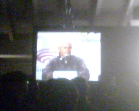 And, I don’t want to insinuate only a negative attitude towards the convention. I was able to get a glimpse (from a distant) of Gillian Anderson & David Duchovny of X-Files fame. And that made more than worth the convention experience for myself. It’s one of the few shows on public TV that I can speak of obsessively in a trance-like state. There to promote the summer release of X-Files 2, Chris Carter (creator), Frank Spotnitz (writer) and the two stars were on stage giving a Q&A. Audience members weren’t allowed to ask for autographs. (Maybe in about 50 years, it will be possible.) For us common folks (who got in late), they were projected on a big screen as they spoke. We viewed a new trailer to the movie, but they didn’t talk much about it during the Q&A. The trailer, captured amateurishly by an audience member, can be found on YouTube here. One of those groupie members you hear screaming in the background is probably me. :mrgreen: Both actors still look good, even after all these years (the power of Hollywood). I was only able to take the following pics with my cell phone. Sorry, pretty fuzzy images. Somebody actually filmed the entire Q&A on Youtube, but you gotta have patience, it’s like 17 clips total. If you listen carefully, people were hollering out,”Where’s Xzibit?