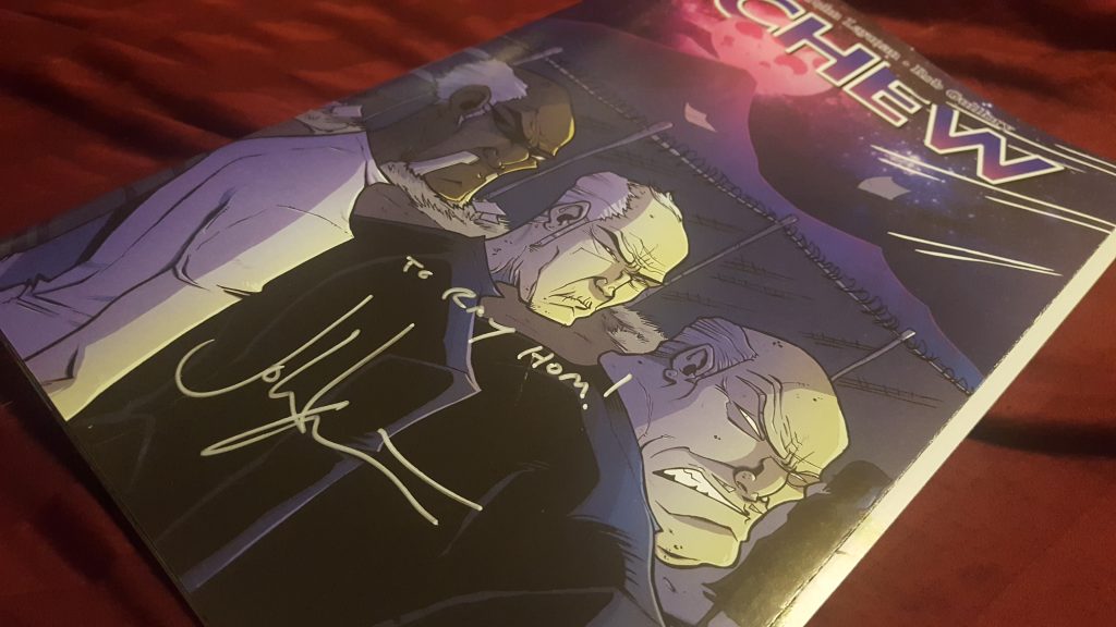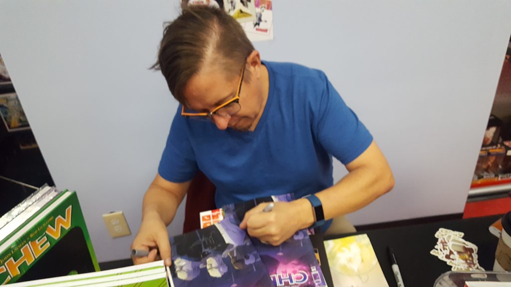 Sonam and I met John Layman, creator & writer of the Chew comic series, about Tony Chu, a Chinese American FDA agent, who is a cibopath – powers that absorb the memories and abilities of anything or anyone he consumes. (Reread that to try and make sense of it. But it’s good stuff!). This took place at Illusive Comics & Games, and he was signing the final issue of the series. I feel complete (for now)… onto the next Nerd event!