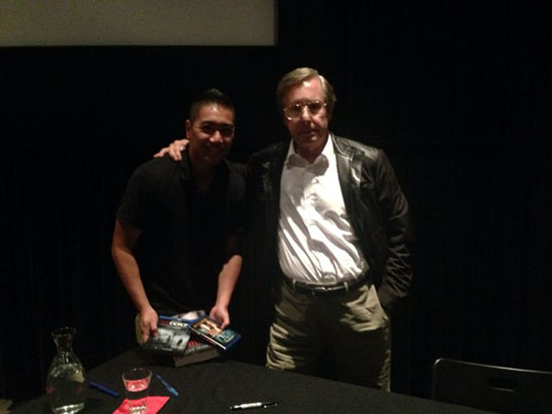 When it was almost my turn to meet Mr. Friedkin, Eszter had her camera ready to take a pic of me with the super director. But, the hostess stares me down and says,”No pictures!” Whatda…? Arrggghhhh… but as I nervously approached my turn to to meet William Friedkin, he said a firm “Hello” and quickly grabbed my book and the movies in my hand, asked me my name, and signed away. I was taken aback and didn’t even know what to say but “I watched both movies various times”. Like classic Friedkin speak, he started telling a story about… I have no idea what he was talking about… but ended with something about “hope you don’t leave 7-Eleven with a gun.” People around us giggled a bit, but I was rummaging through my brain “Did William Friedkin tell a story with a punchline I didn’t get? He’s not David Lynch. I get Friedkin movies. But I didn’t get this one joke he just personally told me?” Joooyyyyy!!! Then I smiled, giggled, watched how his signature scribbled across one of my fav horror flicks – “The Exorcist” – being etched in history, and said “Can I take a quick picture with you?” Mr. Friedkin stood up quick, put his arm around my shoulders, looked toward Eszter holding the camera. And, we both smiled at the hostess.