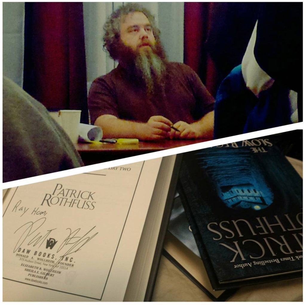Last evening, at the scifi Borderlands bookstore in San Francisco, I got to hear speak and meet Patrick Rothfuss, writer of the epic fantasy series “The King Killer Chronicle” novels, entertaining speaker, and drunk tweeter. I discovered his work when I watched a SDCC2014 panel with GRRM (creator of Game of Thrones) about world building, and Patrick stole the show. Now I’m inspired to drunk tweet a novel.