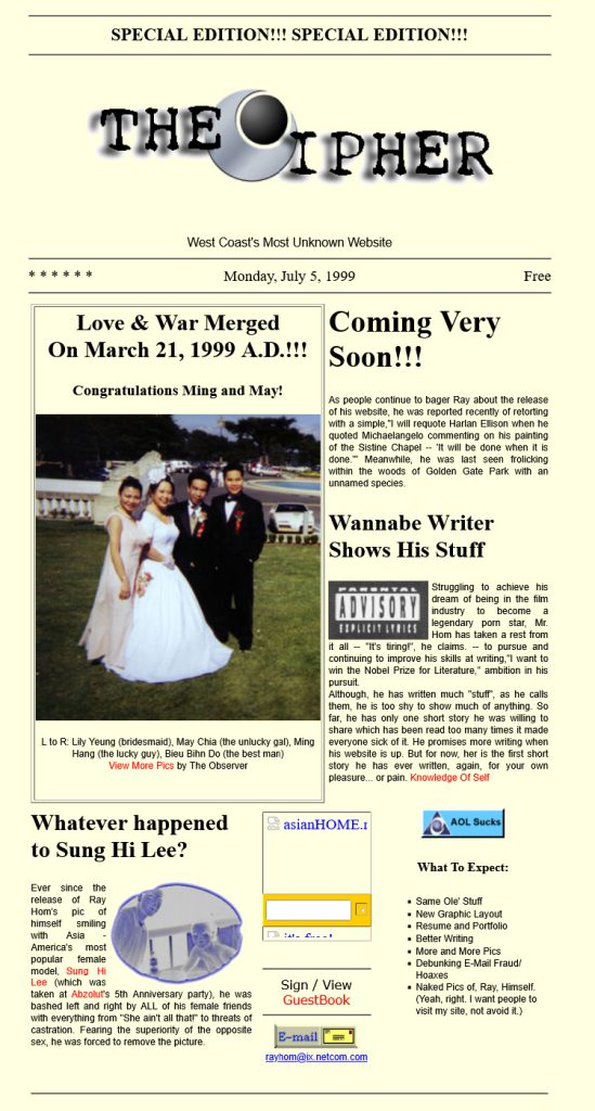 Below is what my website, first looked like, in 1999. It got progressively worse than this, before I even knew what good design was. I was going for a newspaper look, and some have said it was a decent attempt. I created the page, mainly to promote my writings and share photos of my personal life with my friends, on rayhom.com. That date, is the actual date when I had put it live.