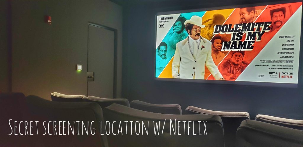 Bo! was able to RSVP a “secret screening” of Netflix’s “My Name Is Dolemite“. It was in a secret location in San Francisco (well, not super secret but a super limited screening). We got there first. I’d say the room sits at most 30 people, which eventually filled up to about half.